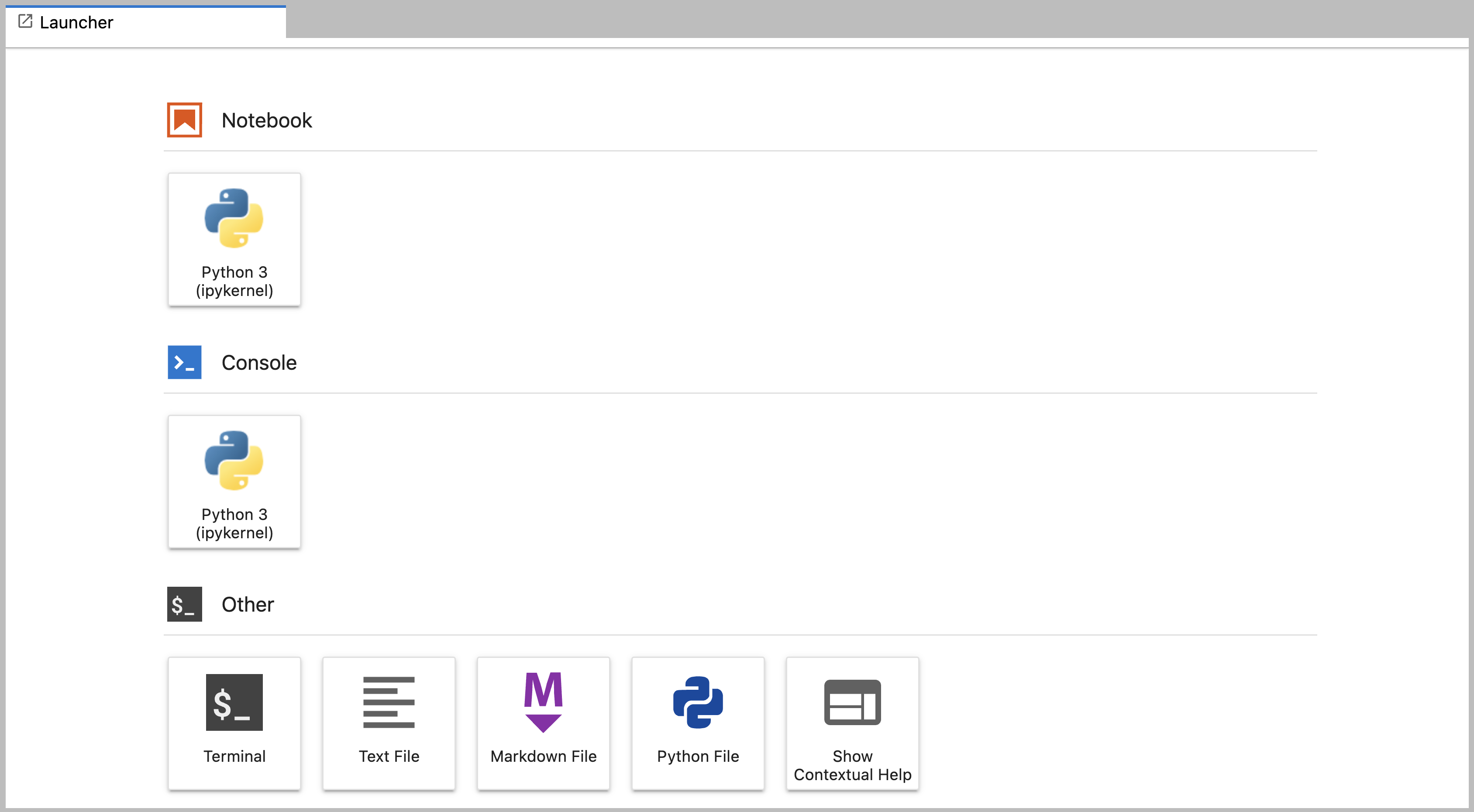 To open a new notebook click the Python 3 icon under the Notebook header in the Launcher tab in the main work area. You can also create a new notebook by selecting New -> Notebook from the File menu in the Menu Bar.