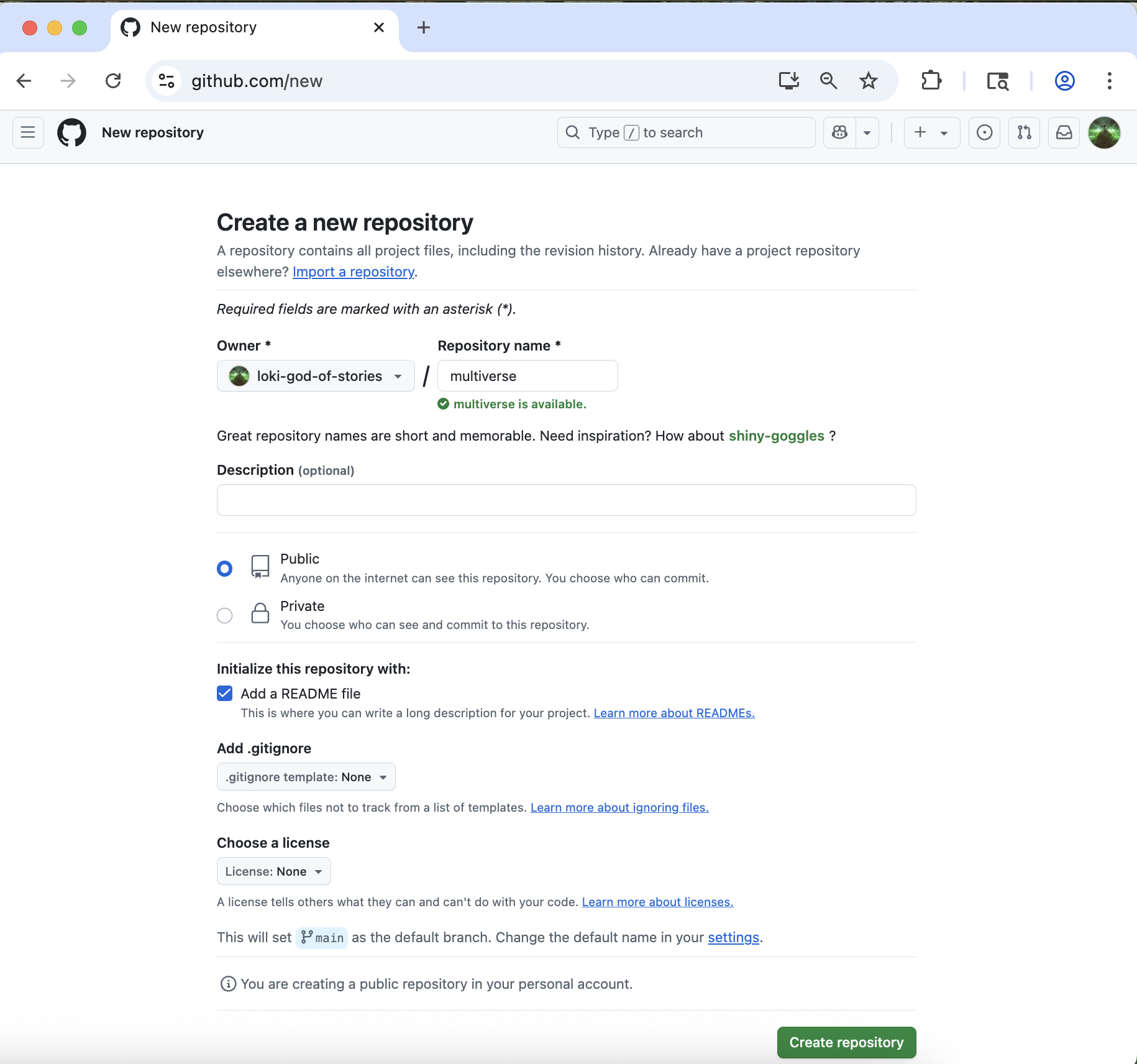 Select your Github username as the “owner”.