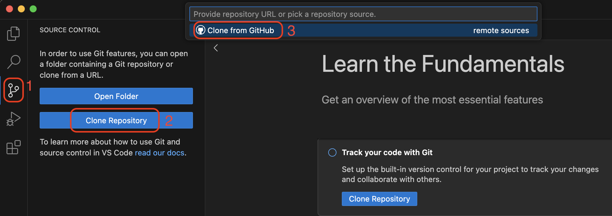 In your new VS Code/Positron window, go to the “Source Control” pane (the 3rd one down). Click “Clone Repository”, and then click “Clone from GitHub”.