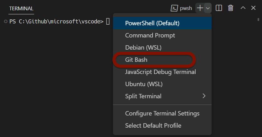 If you are on a Windows computer, you will need to specifically open a GitBash terminal. Find the “+” icon in the terminal pane, and click the carrot dropdown icon next to it. Click “GitBash”.