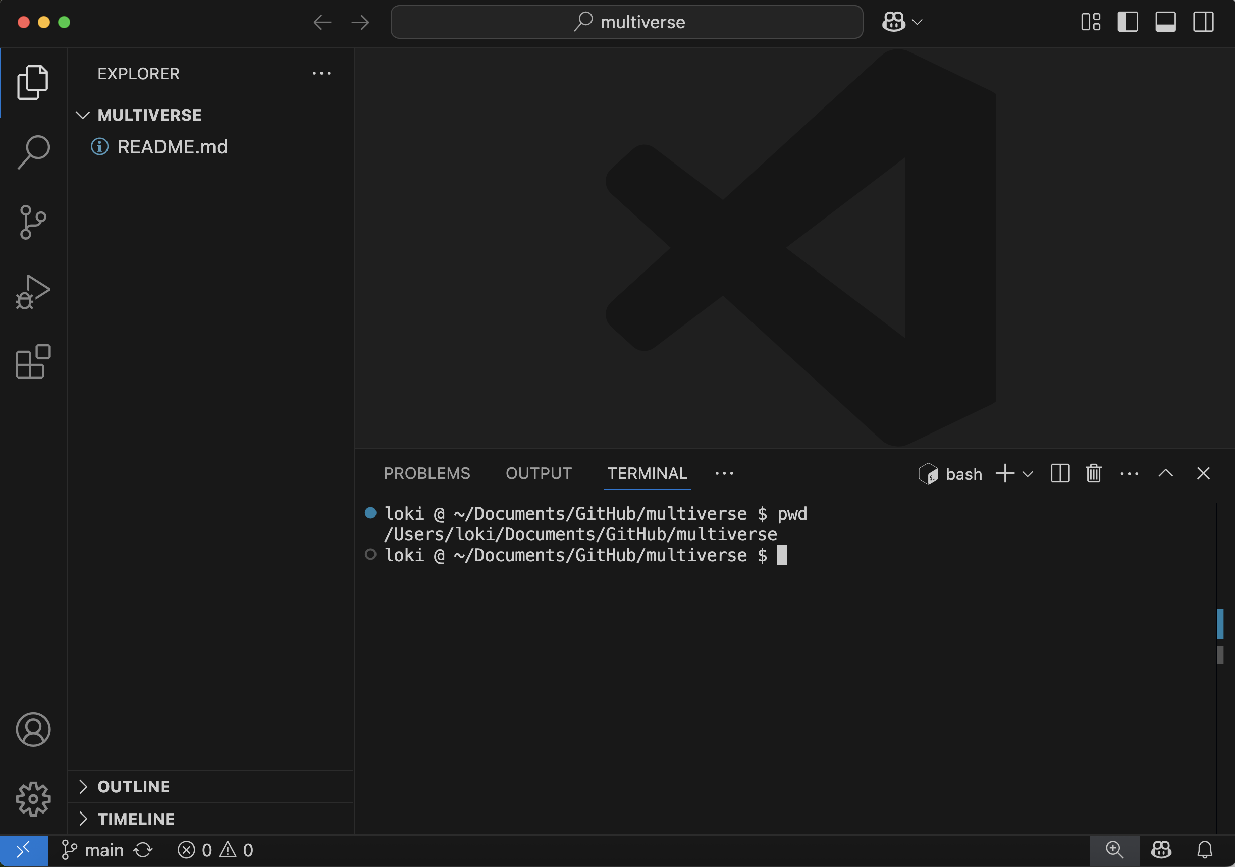 You should now have your empty multiverse repo open, with a Bash terminal open, and you are ready to start typing your first git commands!