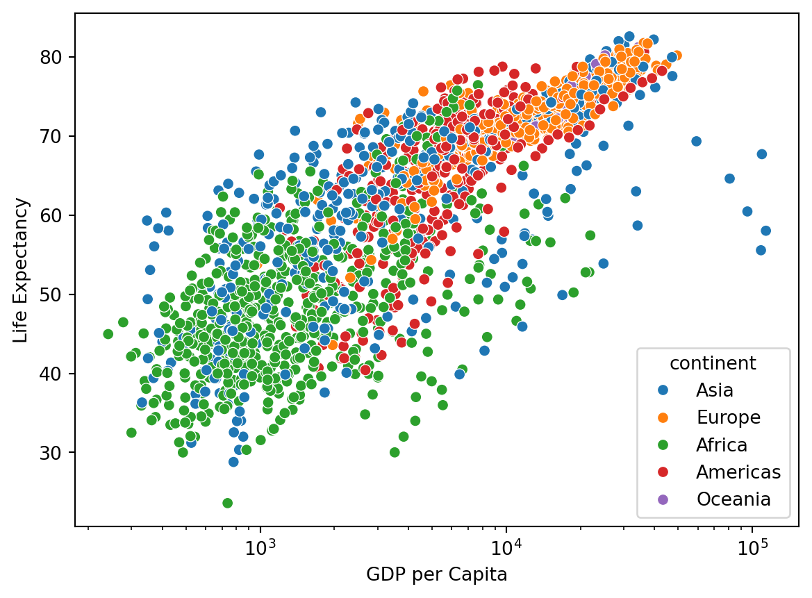 ).set(xscale="log", ylabel="Life Expectancy", xlabel="GDP per Capita")